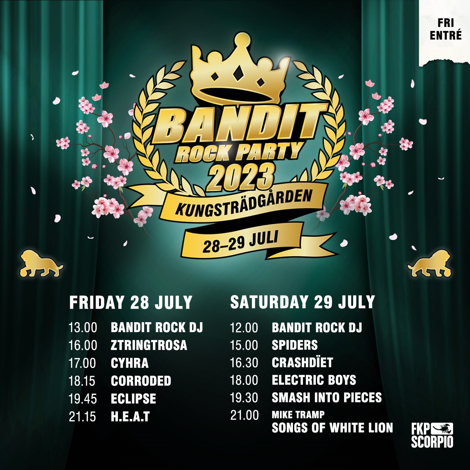 Vem gillar inte en stadsfestival med fri entré mitt i sommarsäsongen? På scen i år ser vi Mike Tramp – Songs of White Lion, H.E.A.T, Smash Into Pieces, Eclipse, Electric Boys, Crashdïet, Corroded, Cyhra, Spiders och Ztringtroza. Kolla in spelschemat och pricka in dina favoriter – eller varför inte allihop!