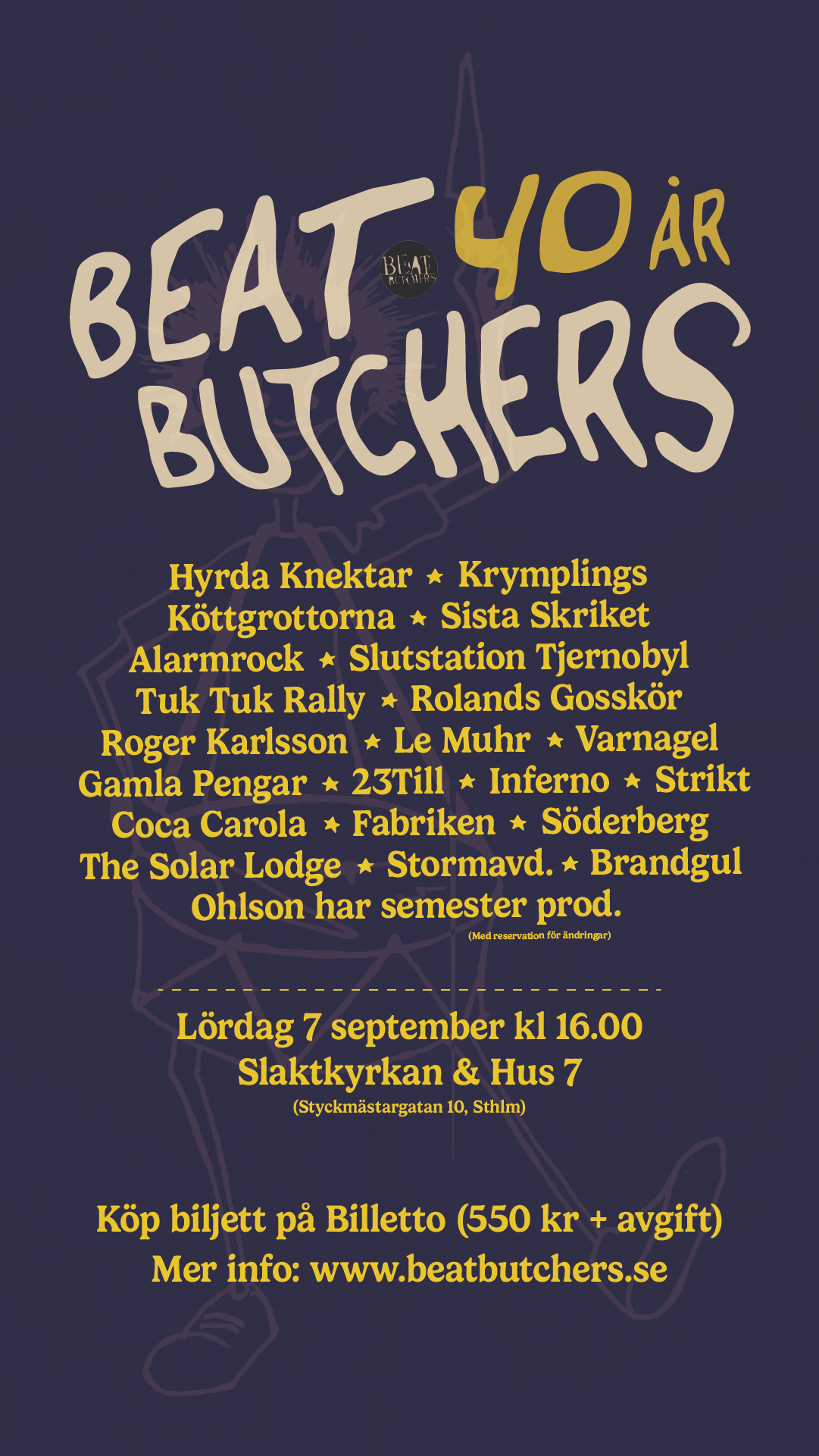 Hösten 2024 fyller det oberoende skivbolaget Beat Butchers 40 år. Det firas med en stor jubileumskonsert på Slaktkyrkan och Hus 7. Hela 22 av bolagets band sluter upp till kalaset, varav flera återförenas för just detta tillfälle.
