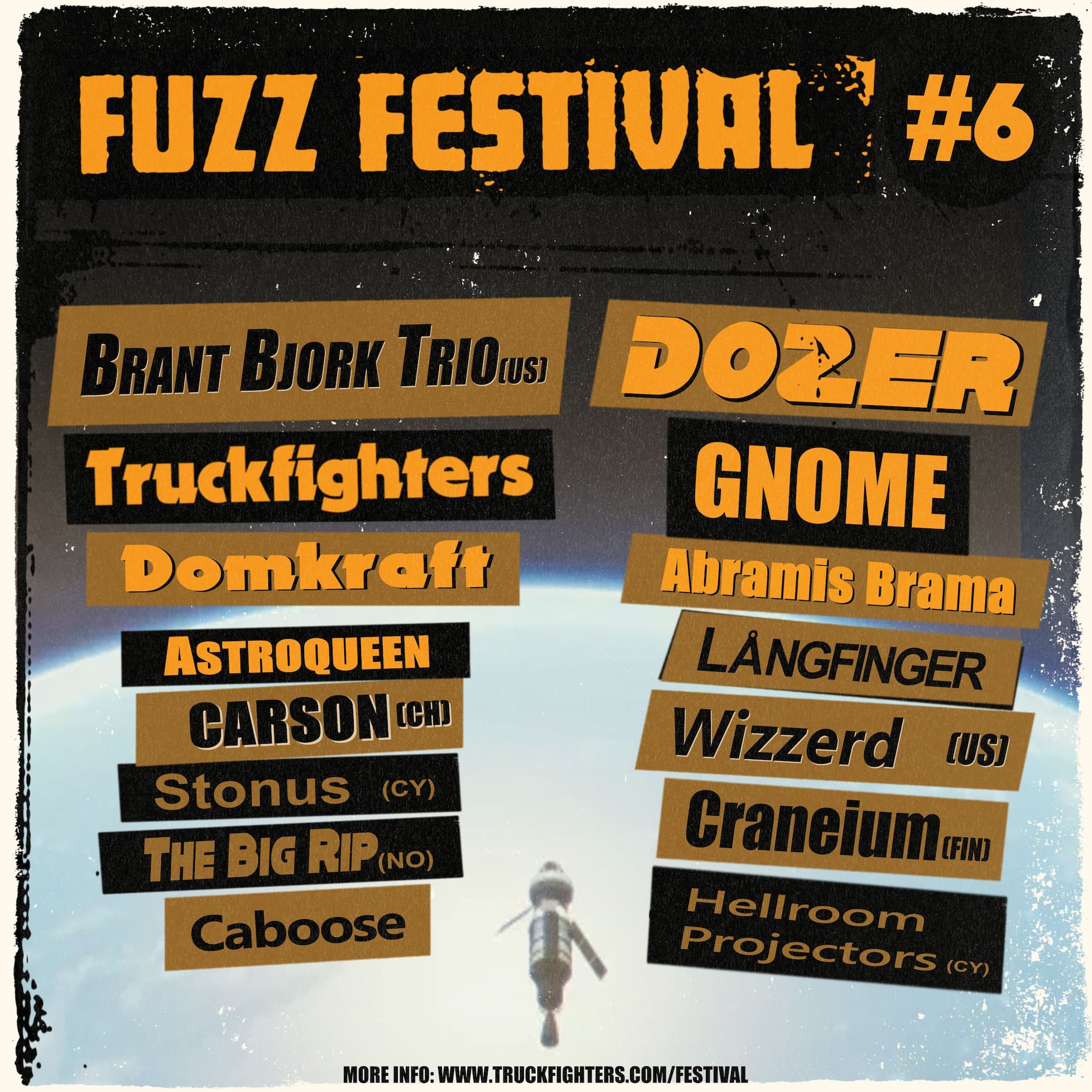 Truckfighters Fuzz Festival presenterar årets sista bandsläpp: Abramis Brama, Astroqueen och Caboose. Årets lineup är därmed komplett! Tidigare släppta band är Brant Bjork Trio, Dozer, Truckfighters, Gnome, Domkraft, Wizzerd, Långfinger, Craneium, Carson, Stonus, The Big Rip och Hellroom Projector.