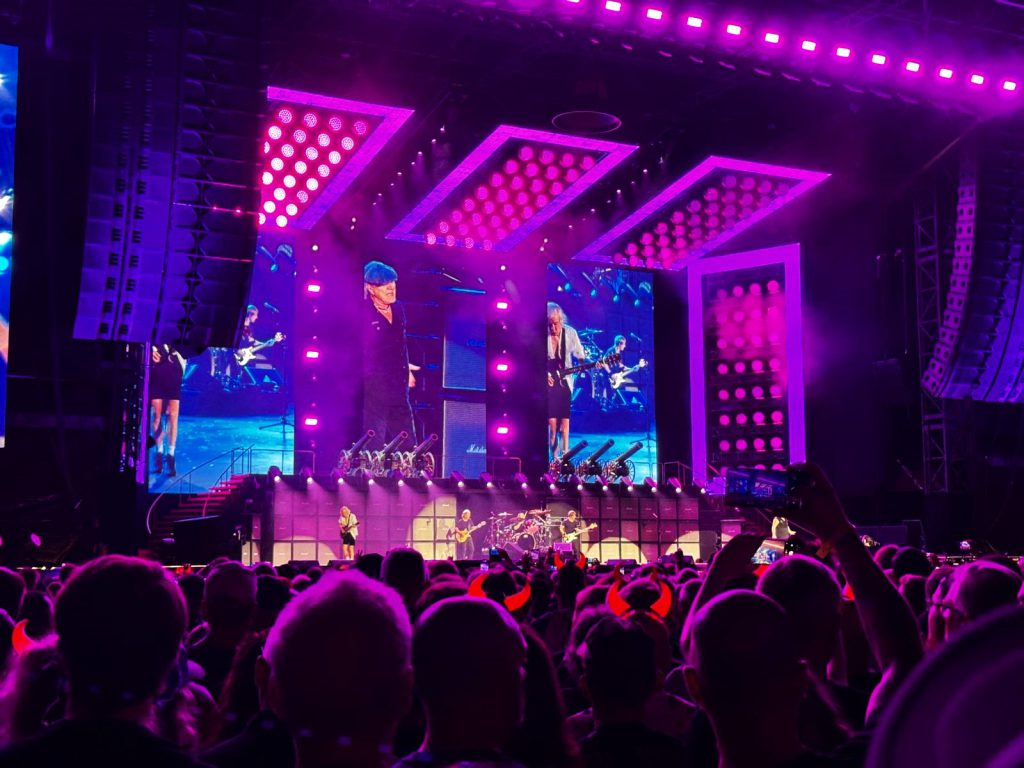 Jag har på förhand hört vissa kritiska uttalanden om Brian Johnsons sång. Han har alltid varit rosslig, det är liksom lite det som är hans signum men ovanpå det är han dessutom 77 år och var till och med borta från scenen några år för att inte riskera att bli döv. Nu går han ut och bara kör mot alla odds. Och hur låter det? Bättre än på länge, åren som han höll sig borta från turnerandet tycks ha gjort honom gott. När kvällen inleds med “If you want blood (you got it)” så riktigt morrar Brians fram tonerna, ackompanjerad av Angus sylvassa gitarrspel och ständiga energi. Vilken inledning! Redan som andra låt får vi sedan den effektiva “Back In Black” och när Brian ropar “We´re gonna have some fun!” så inser man att han verkligen menar det.