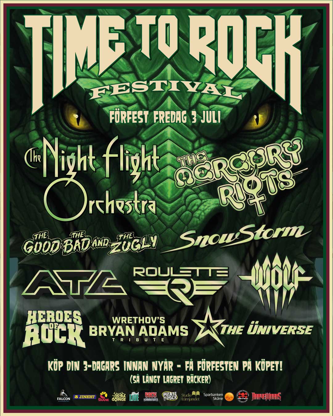 ”Green Hills Over Glumslöv” vilket ger oss en ledtråd om gruppens ursprung, nämligen i Helsingborgstrakten. Det som från början, åtminstone för publiken, kändes som ett lyckat sidoprojekt till medlemmarnas ordinarie karriärer, växte snabbt till ett framgångsrikt band. Sjunde skivan, på tretton år, kom ut i våras och heter ”Give Us the Moon”. Sedan 2019 är The Night Flight Orchestra ett åttamannaband, eller närmare bestämt ett band med sex män och två kvinnor. Detta gäng kommer att förgylla vår förfest. En flygande start på festivalen helt enkelt!.