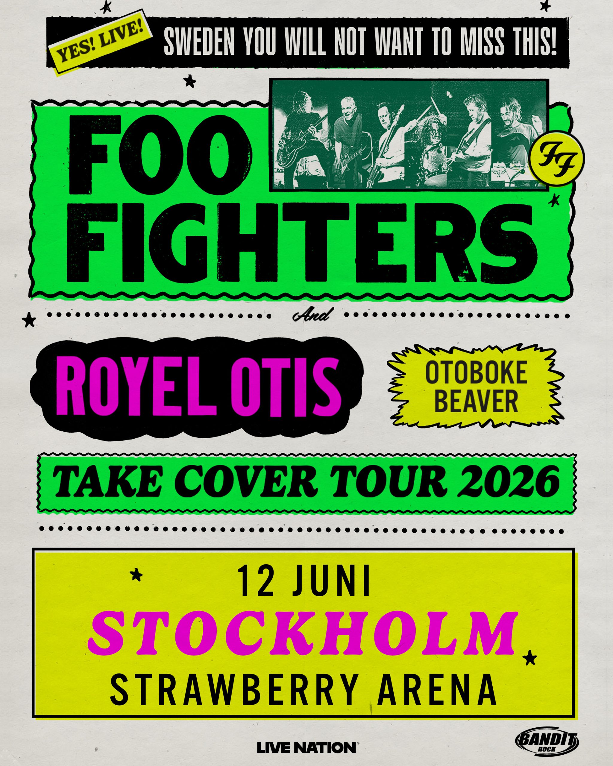 Take cover, Europa… Amerikas främsta rock’n’roll-ambassadörer Foo Fighters tar med sina maxade ljudexplosioner till våra breddgrader i sommar. Dave Grohl, Nate Mendel, Pat Smear, Chris Shiflett, Rami Jaffee och Ilan Rubin kommer att leverera sina klassiska rockhymner på arenor, stadiums och festivaler i Europa under sommaren 2026. Fredag den 12 juni kommer Foo Fighters till Strawberry Arena i Stockholm! Support: Royel Otis och Otoboke Beaver.