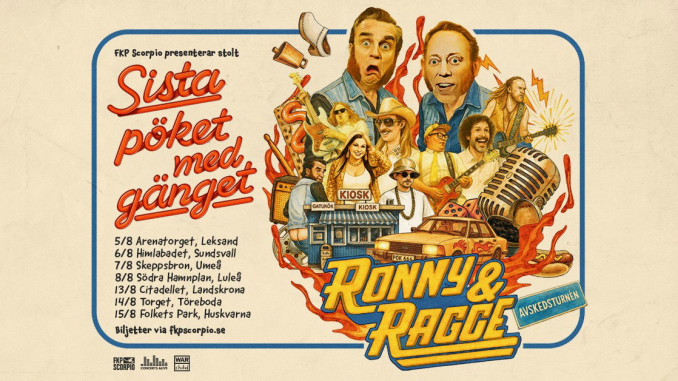 Efter den brakande succén med comeback-turnén ”Ingen Jääla Skiitturné”, som fyllde folkparker och slottsgårdar i somras snabbare än någon hann säga “Fårrd”, är det nu dags att säga hejdå. På riktigt. Ronny & Ragge, Sveriges mest väloljade raggarduo, ger sig nämligen ut på ”Sista Pöket Med Gänget” – en avskedsturné där de återigen bjuder på skratt, svett, energi och hits.